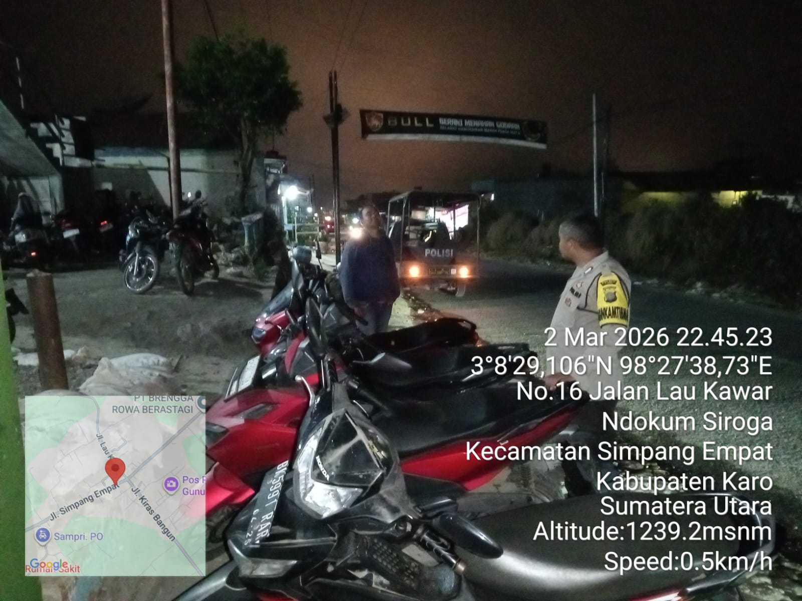 Patroli dilakukan oleh AIPTU F. Sitepu dan BRIPKA J. Ginting dengan menggunakan mobil patroli, menyusuri rute dari Mako Polsek Simpang Empat menuju Jalan Gajah hingga BRI Unit Simpang Empat dan selanjutnya kembali ke mako.