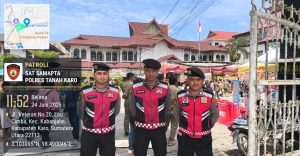 Kabanjahe, Karo — Dalam rangka menjaga keamanan dan ketertiban masyarakat, personel Satsamapta Polres Tanah Karo melaksanakan patroli dialogis ke sejumlah titik keramaian di seputaran Kabanjahe, Selasa(24/6). Patroli yang dimulai sejak pukul 10.00 WIB ini menyasar kawasan rawan dan pusat aktivitas warga guna mengantisipasi tindak kejahatan serta memberikan rasa aman.