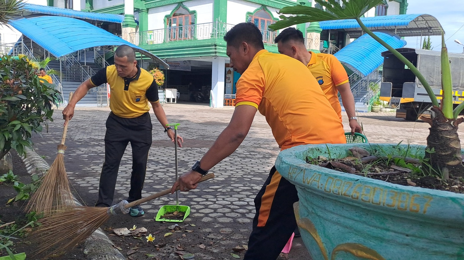 Kegiatan tersebut dilakukan dengan membersihkan area dalam dan luar masjid, termasuk halaman, tempat wudhu, hingga lingkungan sekitar rumah ibadah. Personel kepolisian bersama pengurus masjid dan masyarakat setempat tampak bergotong royong membersihkan fasilitas ibadah agar jamaah dapat melaksanakan ibadah dengan lebih nyaman selama Ramadan.